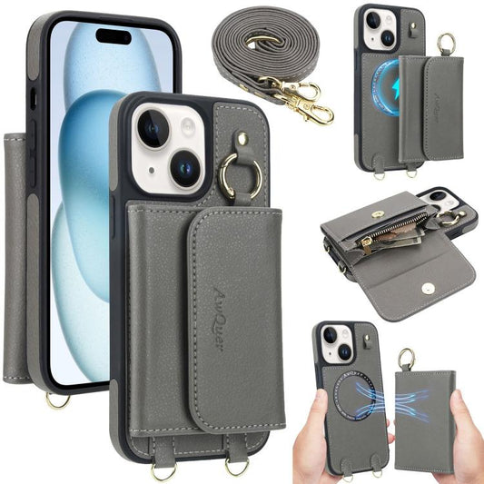 For iPhone 15 AwQuer 2 in 1 Crossbody Wallet Leather Back Phone Case(Grey)