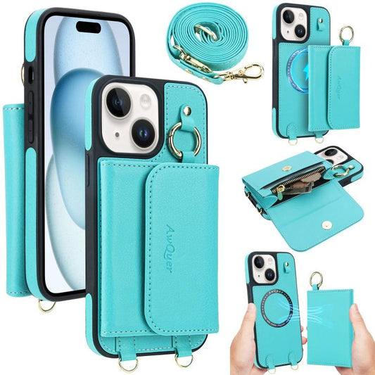 For iPhone 15 AwQuer 2 in 1 Crossbody Wallet Leather Back Phone Case(Light Green)