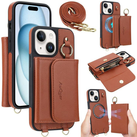 For iPhone 15 AwQuer 2 in 1 Crossbody Wallet Leather Back Phone Case(Brown)
