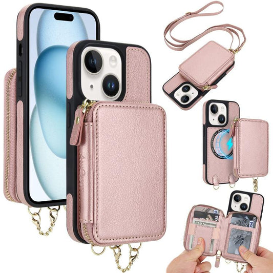 For iPhone 15 AwQuer 2 in 1 Crossbody Wallet Leather Back Phone Case(Rose Gold)