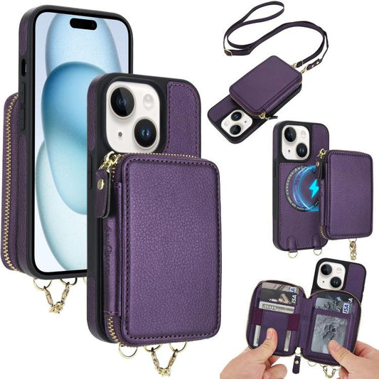For iPhone 15 AwQuer 2 in 1 Crossbody Wallet Leather Back Phone Case(Dark Purple)