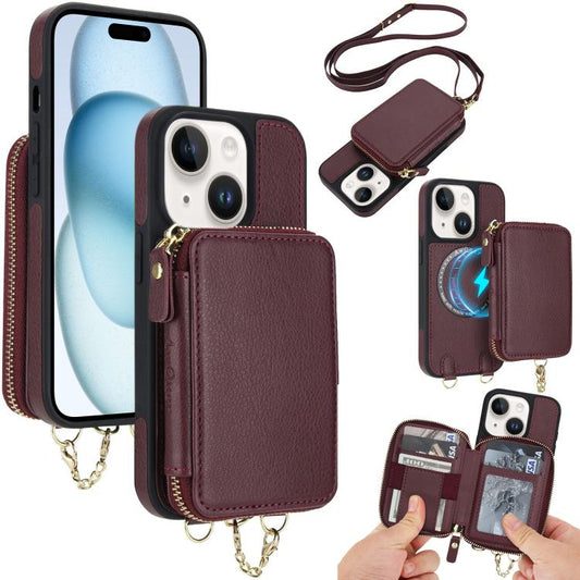 For iPhone 15 Plus AwQuer 2 in 1 Crossbody Wallet Leather Back Phone Case(Wine Red)
