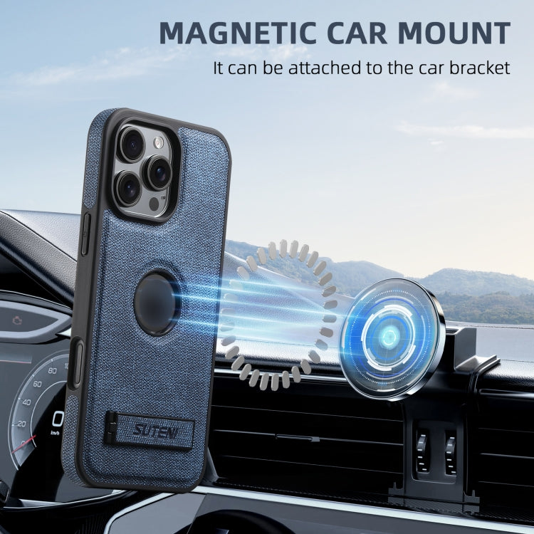 For iPhone 15 Suteni G2 Holder Denim Leather Back MagSafe Phone Case(Blue)