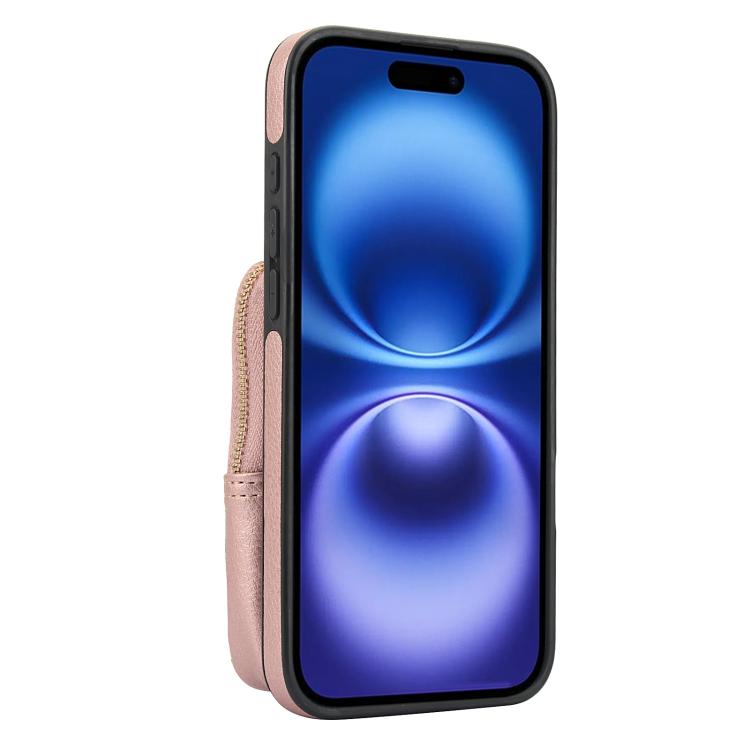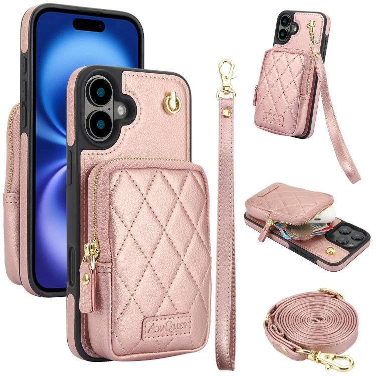 For iPhone 16 AwQuer Crossbody Zipper Wallet Bag Litchi Leather Phone Case(Rose Gold)