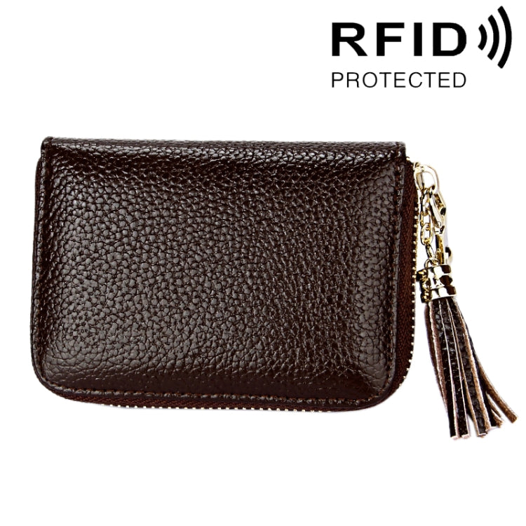 Genuine Cowhide Leather Solid Color Zipper Card Holder Wallet RFID Blocking Card Bag Protect Case Coin Purse with Tassel Pendant & 15 Card Slots for Women, Size: 11.1*7.6*3.5cm(Coffee)